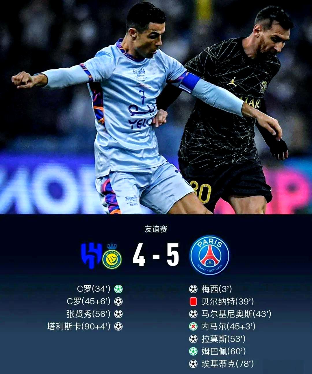 2、巴黎圣日耳曼战胜利雅得利雅得全明星队在友谊邀请赛中对阵巴黎圣日耳曼,梅西进球,C罗梅开二度,最终巴黎圣日耳曼54战胜利雅得全明星这场友谊赛比赛挺精彩的,比分也不错,对得起观众和球迷,梅西和C罗两人在球场相遇的机会少之又少这个比分让人很好接受,巴黎队很多球星,作为亚洲球队的胜利。
